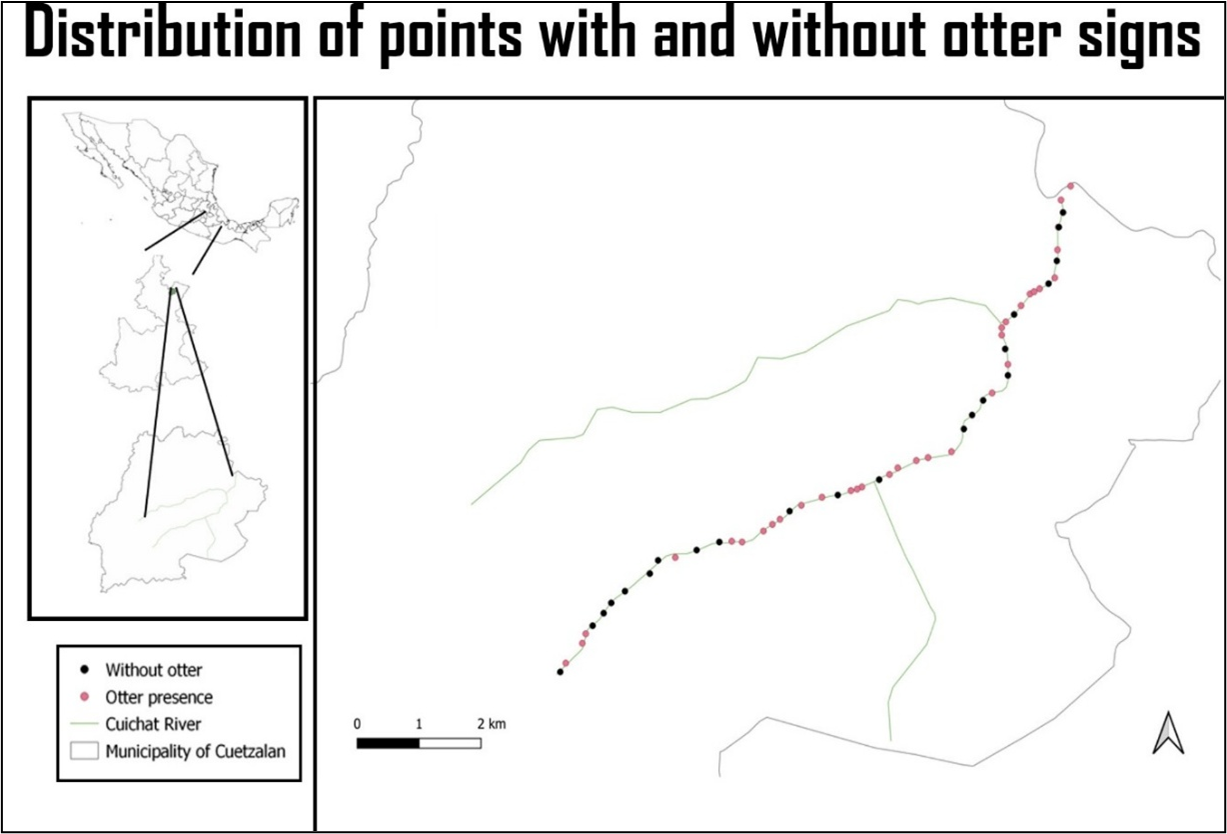 We recorded environmental variables within a radius of 25 m at each site since most monitoring projects by CONANP (Commission on Protected Natural Areas) record variables using these measures; this way, data can be comparable to similar studies by CONANP. While looking for and recording the presence of otter tracks at sites during the six-day field trip. In cases of sites with more than one sign, a circumference that englobed all signs was considered as a reference to measuring the variables within a 25 m radius. In the study area, human activities consisted of livestock production and agriculture, which are common around the river. We also registered indications of urbanization (presence of roads, crop fields, livestock, and houses), which were measured by their presence/absence within the established 25 m radius, as a preliminary evaluation of human impact on otter populations in the Cuichat river, as further studies are required in the future.